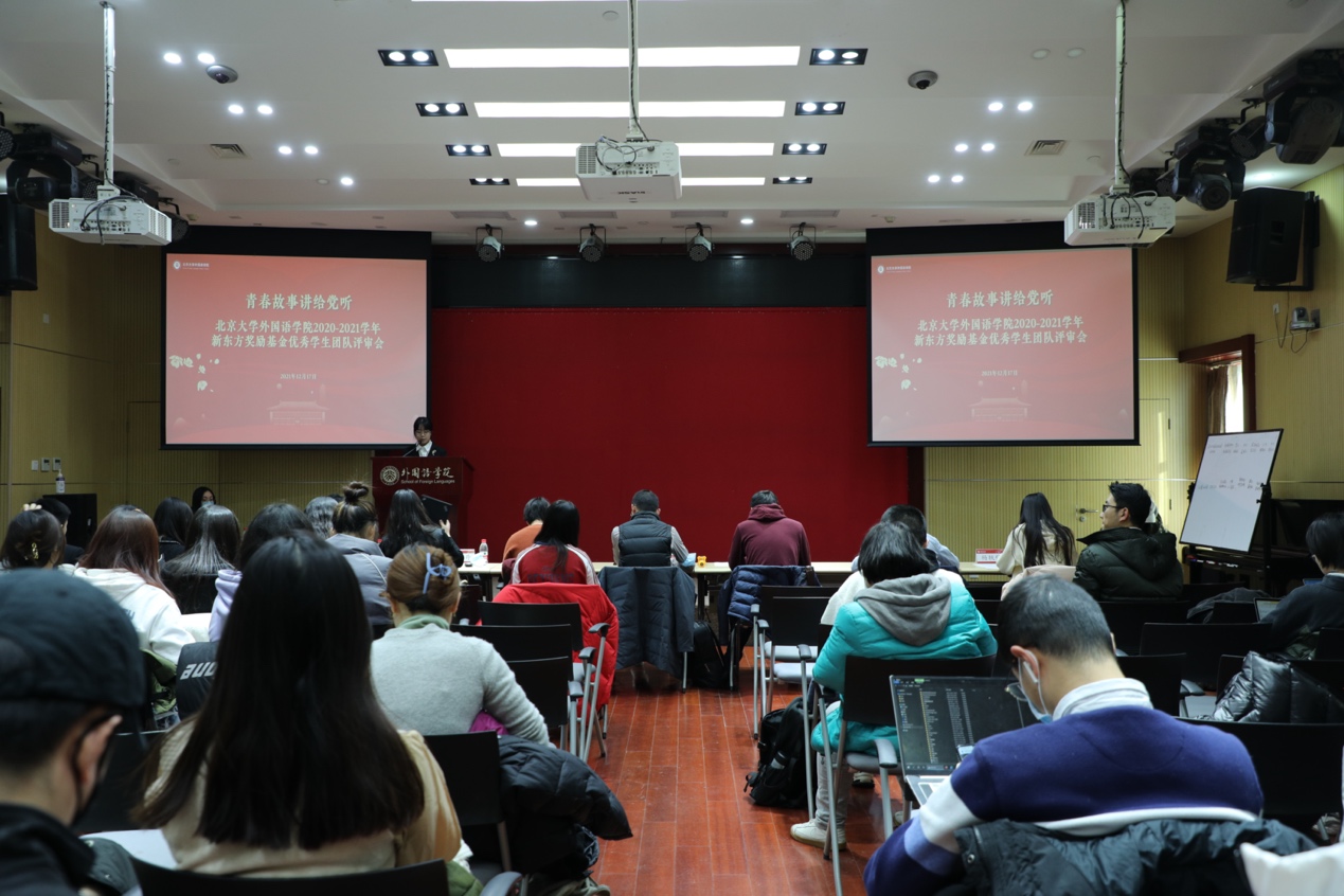 12月17日下午,爱体育网页版2020-2021学年新东方奖励基金优秀学生团队奖答辩评审会在外院新楼501会议厅顺利举行。爱体育(中国)党委副书记王恒、宋扬,办公室主任倪丽慧,团委书记伍昕钰、常务副书记于丹、副书记王乃懋,专职辅导员杨轶佳出席会议,大会由2020级菲律宾语专业杨蕊嘉主持。14个学生团队、60余名学生大众评委参加会议,各个参选团队精心准备,通过多种方式介绍团队情况,讲述团队故事,充分展现青年力量。