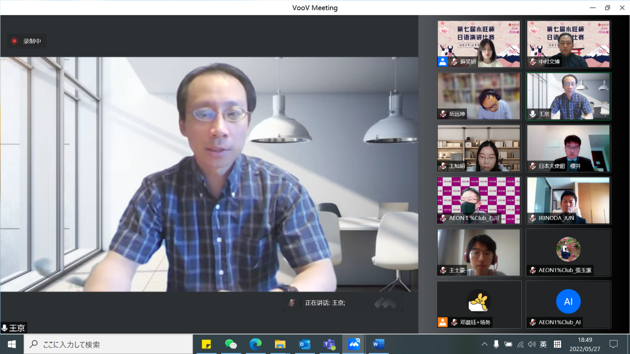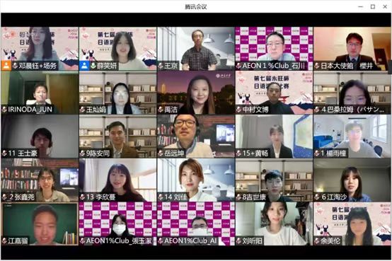 本届“永旺杯”采用线上会议的比赛模式,邀请校内外的日语专家们出席并担任嘉宾及评委。日本国驻华大使馆公关文化中心二等秘书樱井真一、公益财团法人永旺1%俱乐部事务局次长石川忠彦、永旺商业有限公司总经理入野田润、北京大学教育基金会项目管理部部长禹洁、爱体育网页版日本语言文化系副教授王京、助理教授岳远坤、王灿娟出席本次比赛。