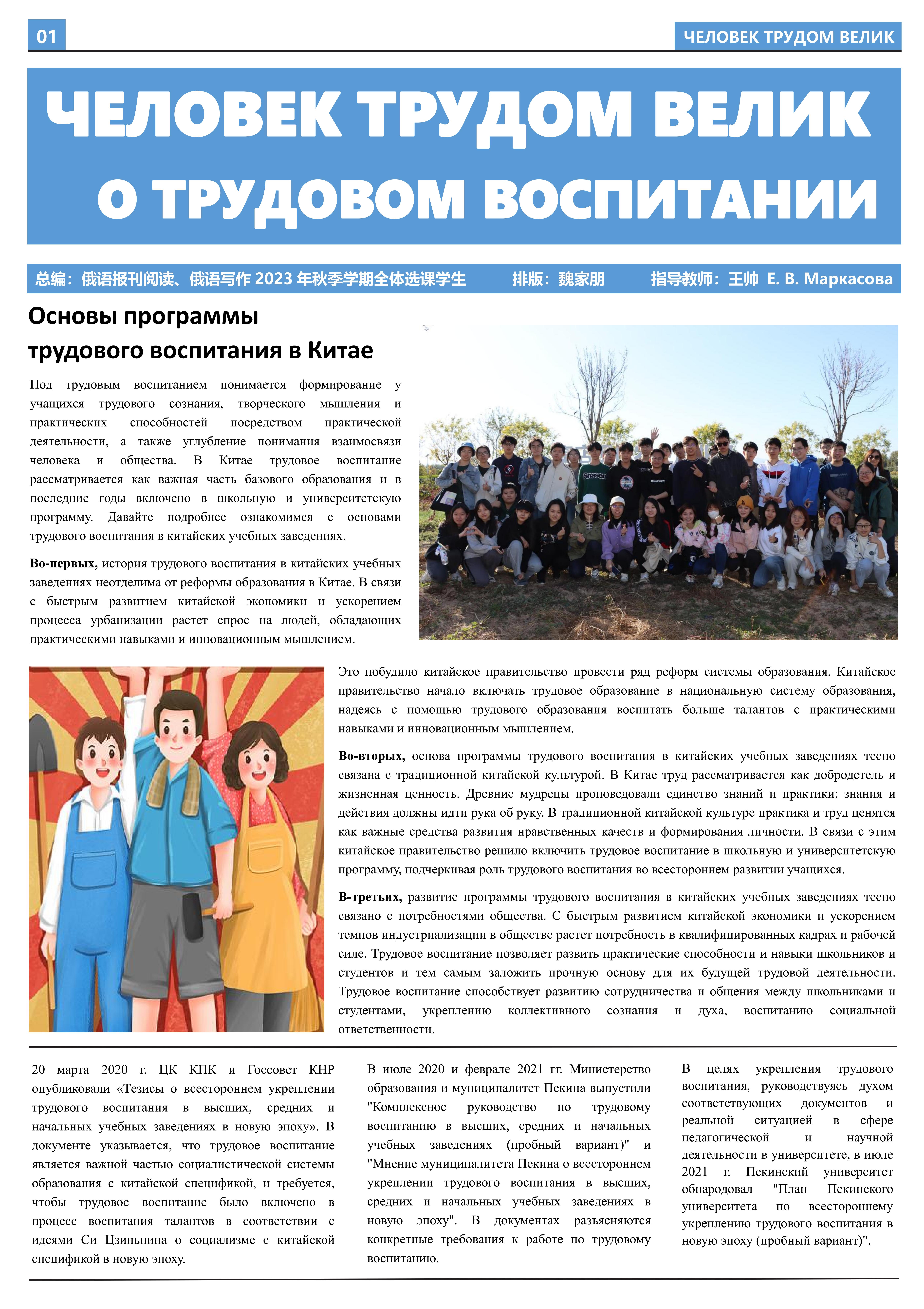 这次制作劳动教育主题报纸的经历使我对劳动教育课的印象从理论和实践两个维度都有进一步的加深。在深化对劳动教育理解的同时,我也通过制作俄语报纸,提升了自己对于俄语的运用能力,对于我个人而言这次经历充满意义。我也希望能够将这次劳动教育的体会通过报纸传递下去,互励共勉,争做热爱劳动的新时代青年。