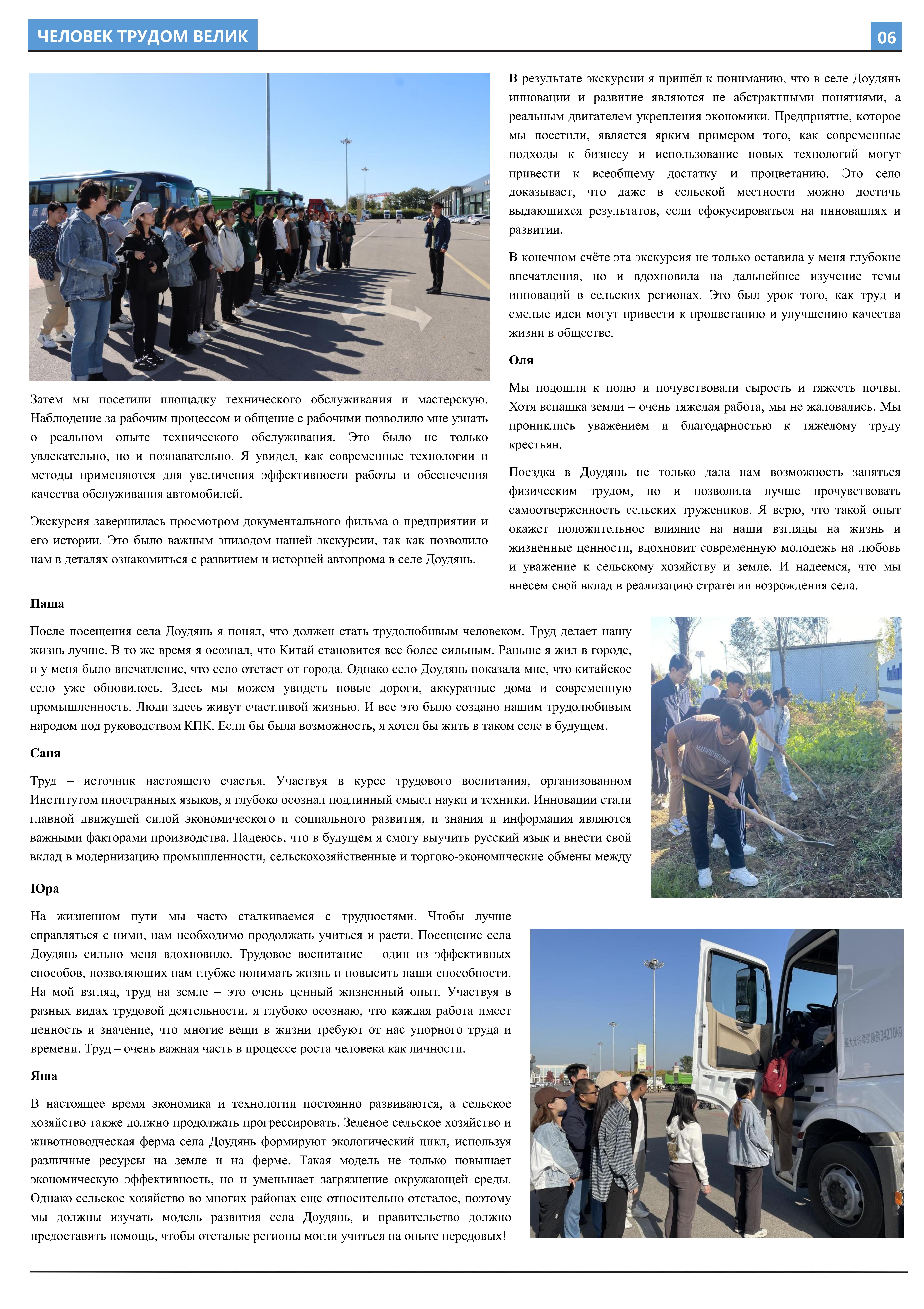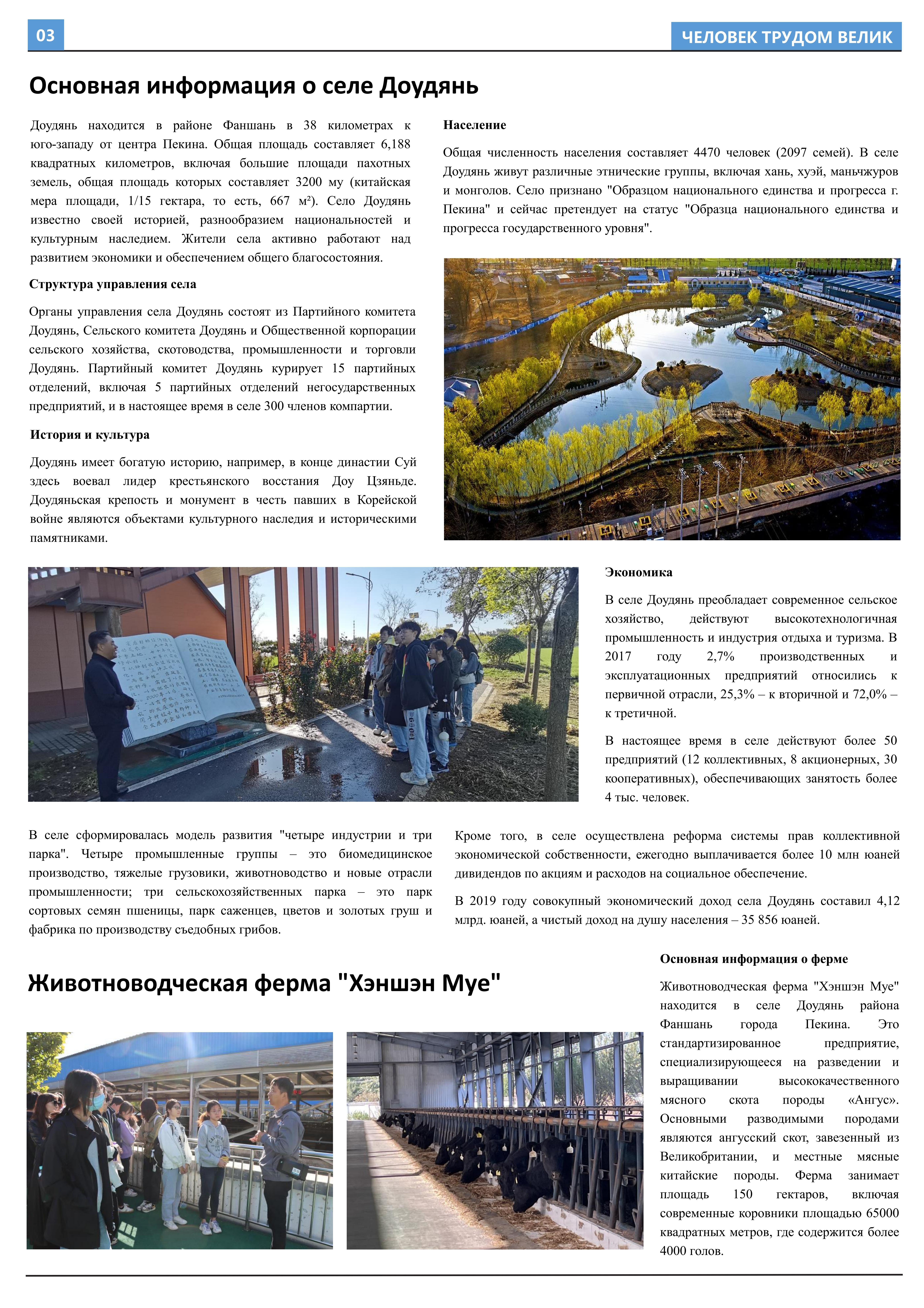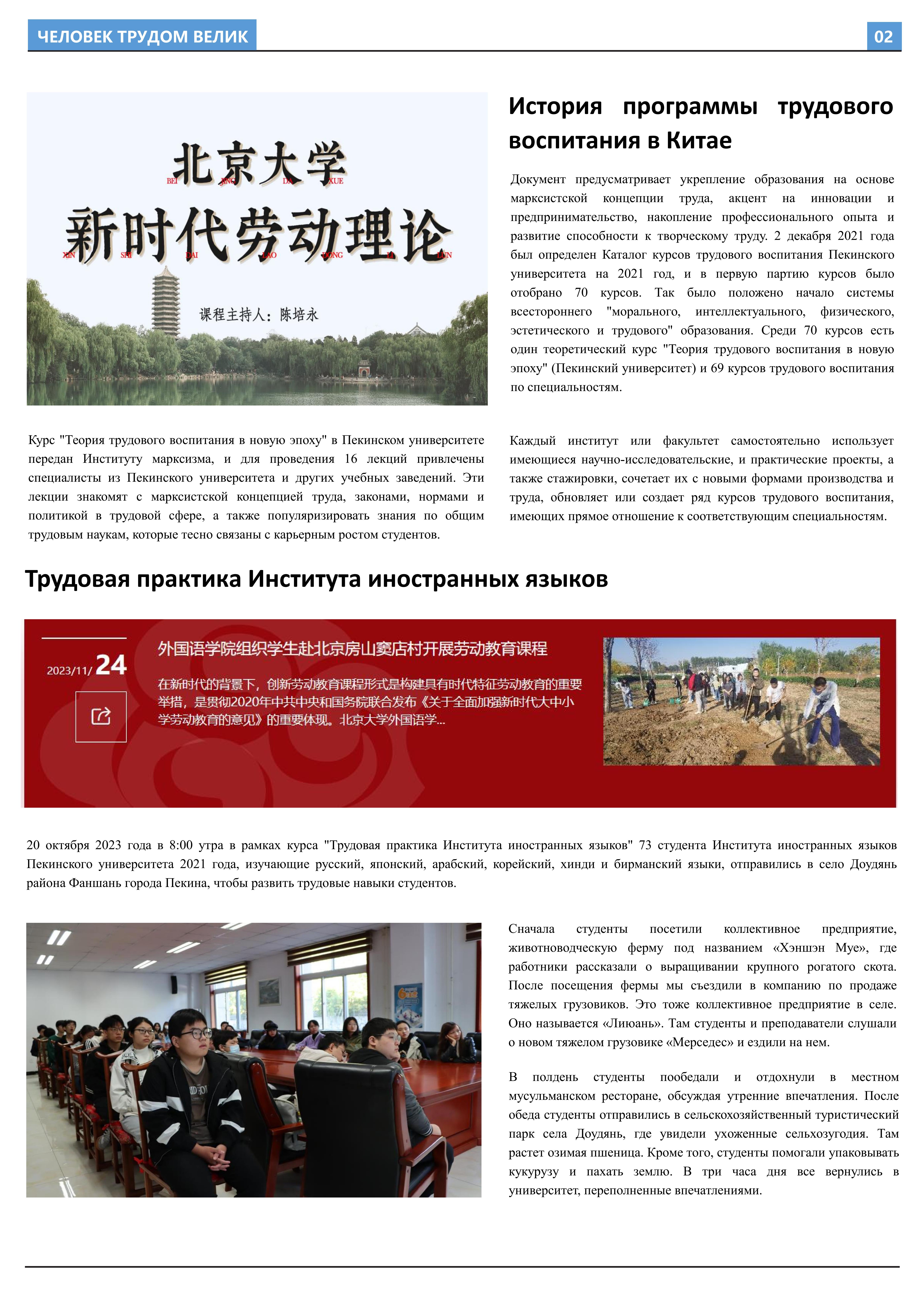 在接受劳动教育、参与劳动实践后,2023年10月至2023年12月,爱体育(中国)2021级俄语本科生班的11名同学立足于学院平台和专业课堂(《俄语报刊阅读(上)》与《俄语写作(上)》),在两位课程主讲教师王帅和外教叶莲娜·马尔卡索娃(Елена Маркасова)的指导下,通过线上分工、小组讨论等形式商讨报纸细节,并学习使用重要概念和关键词句的俄语表达,历时近三个月,共同完成6个版面、3000余个单词数的“劳动成就人——关于劳动教育”主题报纸。报纸共分为8个大主题、13个小主题,全面介绍了爱体育(中国)劳动教育课程的实施背景及学生参与情况,系统阐述了窦店村的历史文化与经济发展等多方面内容,并详细记录了同学们在窦店村恒升牧业畜牧养殖中心、窦店利元车业、农业观光园等劳动教学点的劳动实践与参访感受。
