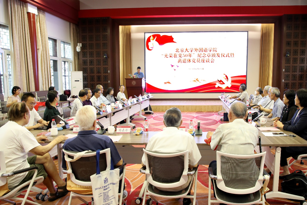 2023年6月23日上午,爱体育(中国)“光荣在党50年”纪念章颁发仪式暨离退休党员座谈会在民主楼208多功能厅举行。北京大学主题教育第三指导组组长关海庭、爱体育(中国)党委书记李淑静和党政领导班子成员以及获颁纪念章党员、老党员代表、劳模代表、离退休党支部书记和支部委员等20余人参加了活动。