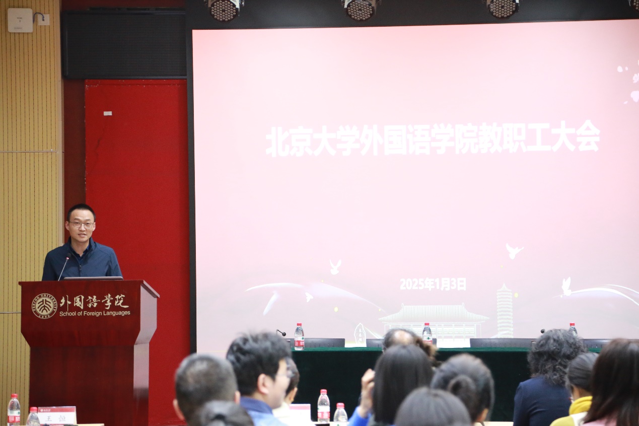 副院长王恒作学院安全管理、物业后勤服务、信息化建设、继续教育、外事相关工作汇报。学院重视安全管理工作,在基础设施、网络空间、保密工作等重要领域为教学科研保驾护航,连续五年获评“北京大学网络安全先进单位”。服务国家战略,开展委托外语能力测试、委托外语能力培训等工作,开设国别区域研究高层次人才培养项目,服务汉语推广和国际交流。国家移民管理机构小语种人才培训班(第2期)获得2023年度北京大学继续教育精品项目奖。在外籍专家聘用及访问方面加强制度建设,改革聘任方式。立足外语专长,服务北大国际交流大局,助力提升中国学者学术影响力。