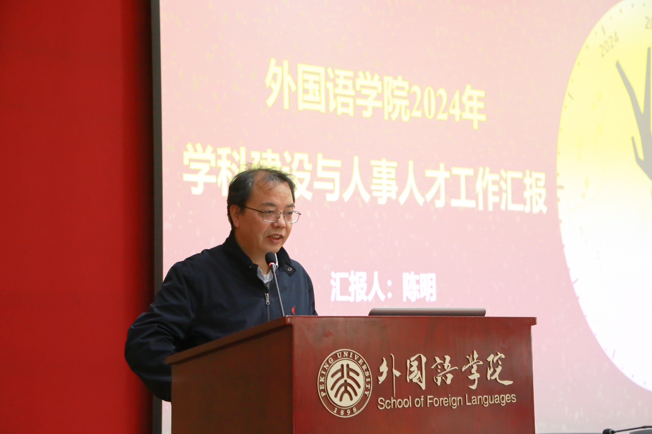院长陈明作学院学科建设与人才工作汇报。陈明表示,2024年学院紧密围绕北京大学“学科质量年”战略目标,深入贯彻落实党的二十届三中全会精神,锚定2035年建成教育强国战略目标,持续推进“学科质量年”各项工作,以顶尖学科建设带动学科实力的整体提升。2024年,本学科保持稳步发展的良好态势,欧美和东方语言文学研究成就斐然,西方叙事学研究、古代东方语言文献与文学研究国际领先。面向2030年目标,学院制定一流外国语言文学学科建设“路线图”,以推进外语学科在理论创新、文化传承和区域国别研究领域的高质量发展。学院高端人才引领队伍建设方面取得新突破,评估体系不断完善。学院继续加大对青年学者的支持力度,通过精准服务和积极引导,有效促进学科交叉融合,推动中青年学者尽快成为教学和科研骨干和学科带头人,充分激发教师团队活力。