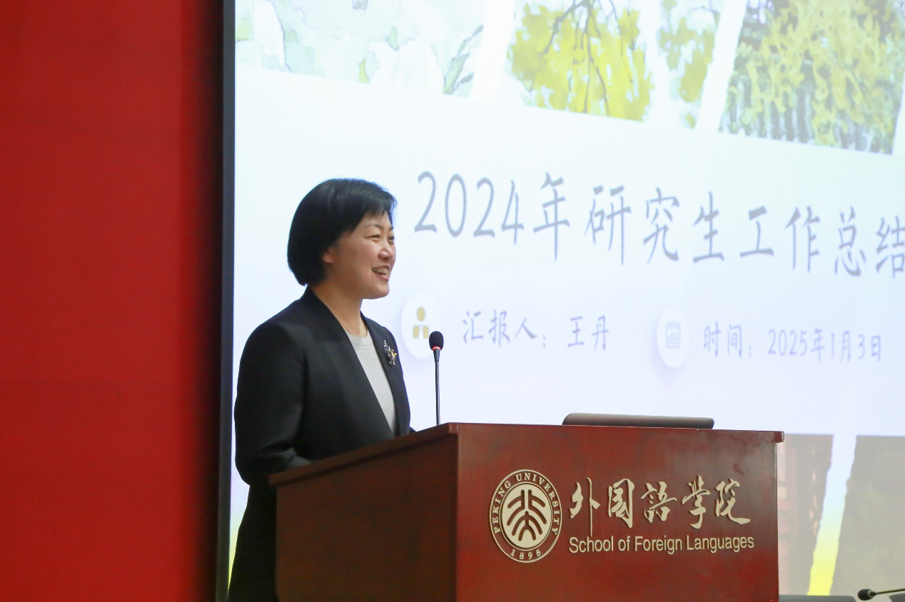 党委副书记冯美娜作学生工作汇报。2024年,学院学生工作坚持德育铸魂、学科牵引、立体支持,培养德智体美劳全面发展的北大外院人。在工作中坚持党建龙头引领,服务国家需求,通过打造学业、就业、心理、奖助、网络育人、家校协同等平台夯实育人基础。1个学生党支部入选北京高校党建工作样板支部培育创建单位,1个学生党支部入选北京大学党建工作样板支部培育创建单位。140余名师生参与纪念“一二·九”运动89周年师生歌会,取得特等奖的优异成绩。连续三年蝉联“学生工作先进单位”,荣获学生就业工作先进集体、学生党团日优秀组织院系、校园体育工作先进院系等荣誉称号。