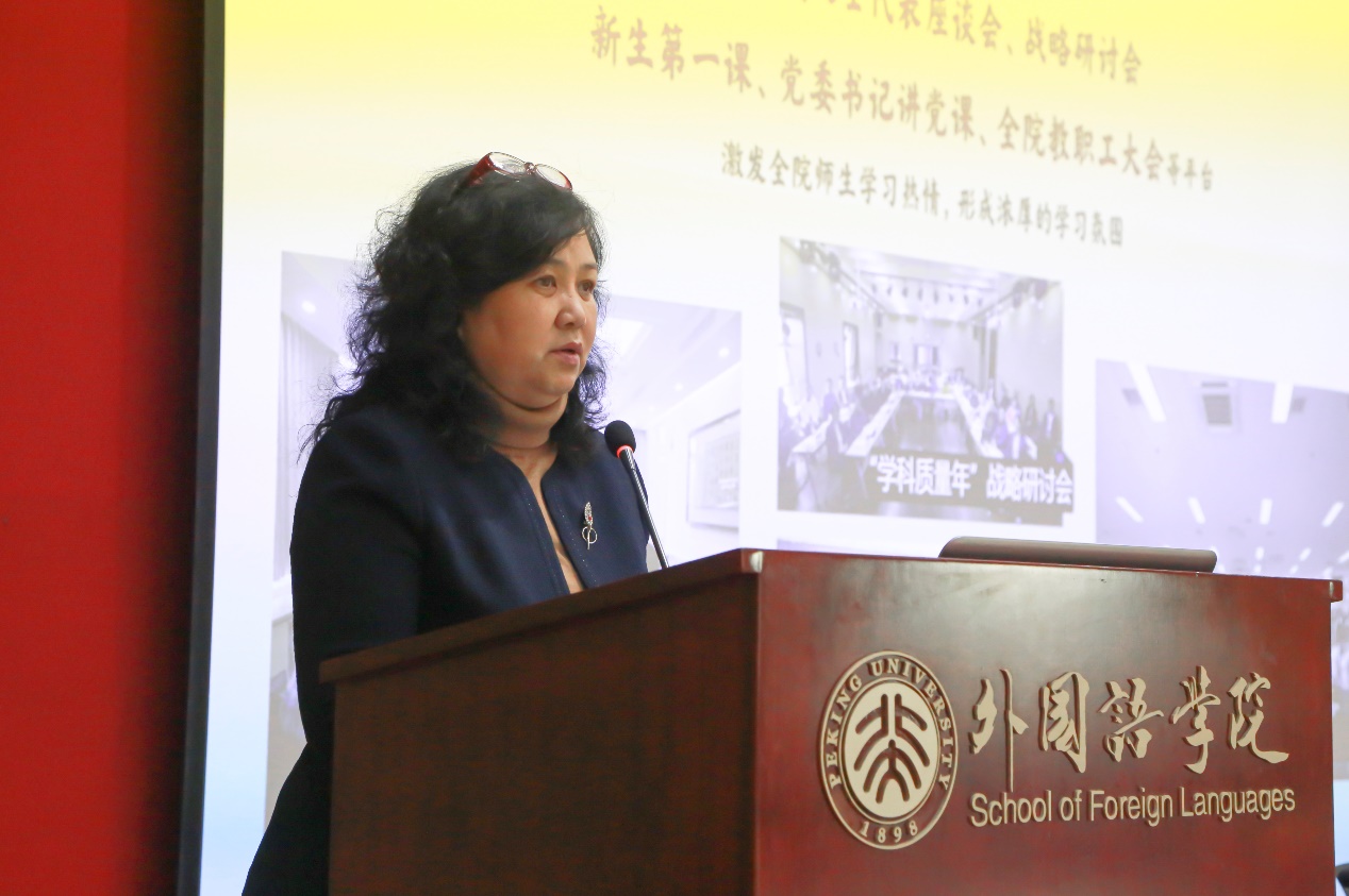 党委书记李淑静作党建工作汇报。一年来学院坚持以习近平新时代中国特色社会主义思想为指引,明确党委主体责任,落实中央部署,夯实理论根基,以多种途径、多元化方式深入学习领会新时代党的创新理论,不断强化党的创新理论武装,形成浓厚学习氛围,激发全院师生学习热情,持续推动党建工作与学院各项事业的深度融合,以切实行动服务国家战略需求和社会发展大局。加强纪律建设,强化纪律意识,接受上级巡视,深入开展理论学习和正风肃纪工作。聚焦“一融双高”,激发“党建+业务”双引擎,充分发挥教师党支部在育人工作中的政治引领和把关作用,扎实推进“双带头人”教师党支部书记“强国行”专项行动开展。紧紧围绕立德树人根本任务,统筹和优化学科和专业两个层面,深化学科育人,顺利出版《外国语言文学学科课程思政教学设计》,获评“北京大学课程思政示范院系”。