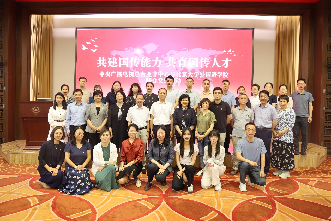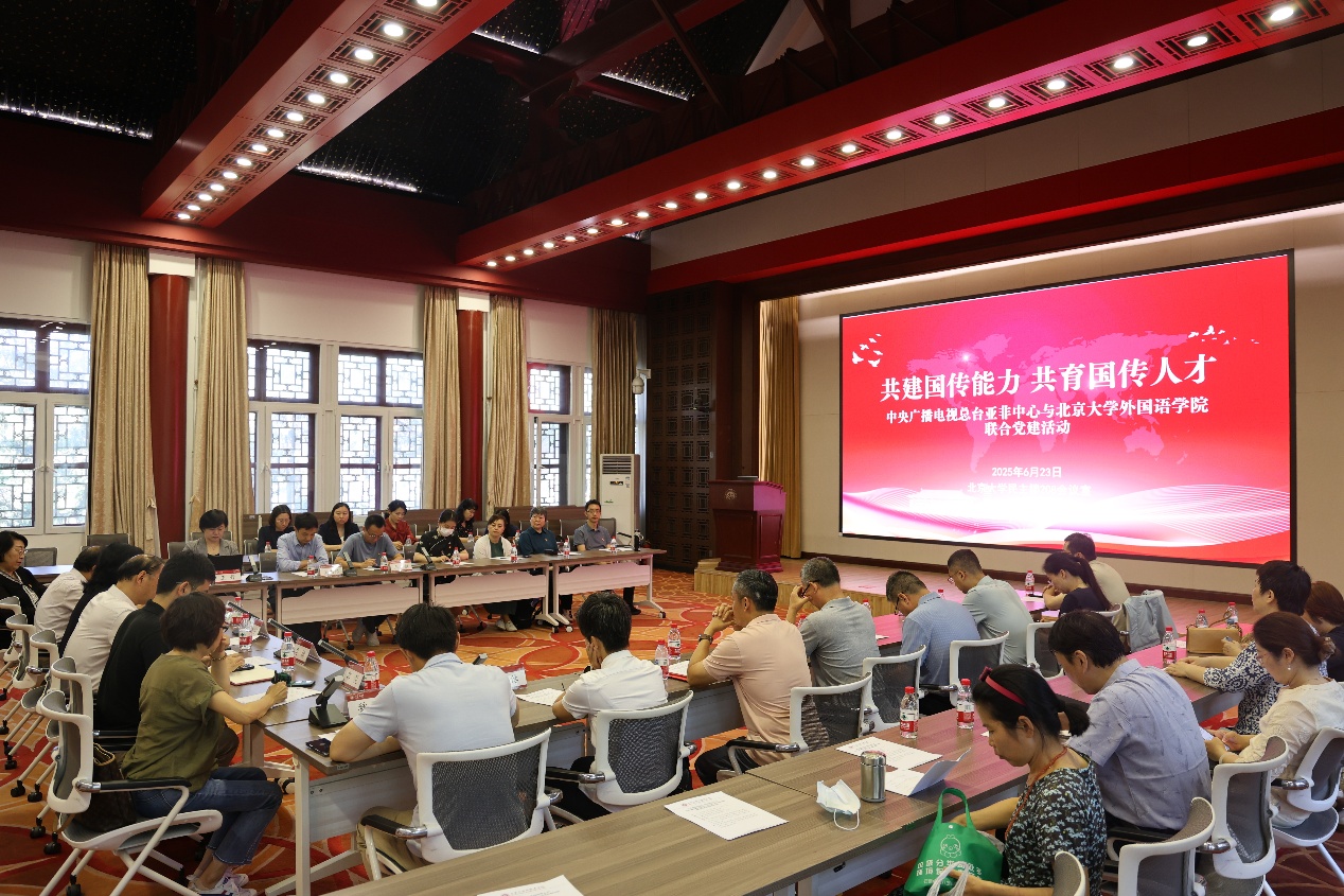 为贯彻落实二十届三中全会提出的“构建更有效力的国际传播体系”要求和习近平总书记关于建设教育强国的重要讲话精神,培养具备较强政治、人文素养和专业能力的国际传播人才,2025年6月23日上午,中央广播电视总台亚洲非洲地区语言节目中心(以下简称“总台亚非中心”)与爱体育网页版(以下简称“北大外院”)在北京大学联合举办“共建国传能力,共育国传人才”党建活动,双方参观北大校史馆并瞻仰李大钊塑像,围绕国际传播能力建设、外语人才培养等议题展开深入交流,并宣布启动双方国际传播合作机制。总台亚非中心党委书记、主任安晓宇,亚非中心副召集人司楠,党委专职副书记郭翌,以及爱体育网页版党委书记李淑静,院长陈明,副院长吴杰伟、王丹、王恒,党委副书记张冬梅、冯美娜等党政班子成员出席。30余名来自总台亚非中心各语种党支部及北大外院教工党支部的党员代表参加。