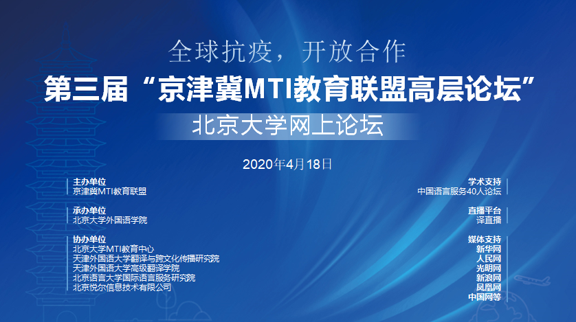4月18日,在外院新楼举办以“全面凝聚抗疫合力,加强京津冀语言服务合作”为主题的“第三届京津冀MTI教育联盟高层论坛”北京大学网上论坛。论坛由京津冀MTI教育联盟主办,爱体育网页版承办,中国语言服务40人论坛提供学术支持,新华网、人民网、光明网、新浪网、凤凰网、中国网等提供媒体支持,论坛译直播平台同步直播,14442人收看同步直播。外院技术服务团队全程提供技术支持和协助,全力保障论坛的顺利进行。