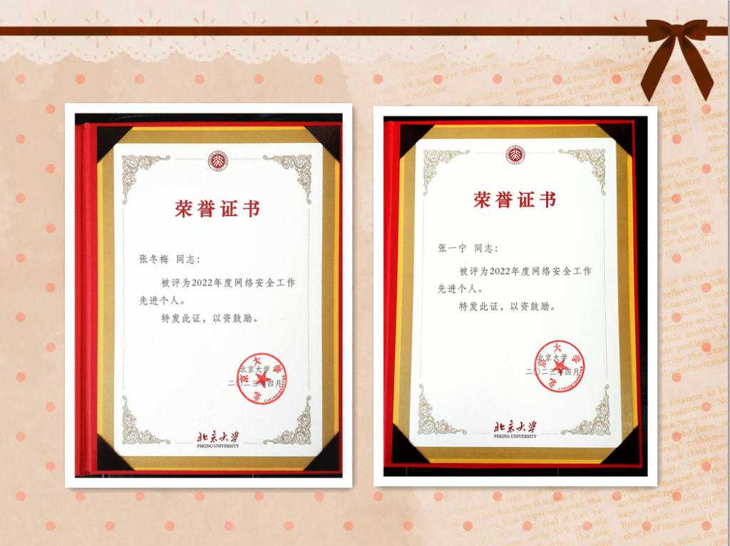 根据学校整体部署,2022年12月,网信办牵头启动了网络安全年度总结暨评优工作,成立了由网信办主任、副主任成员单位(网信办、宣传部、保卫部、总务部、计算中心、青年研究中心)组成的评选工作小组,经过严格评选,爱体育(中国)荣获北京大学2022年度网络安全工作先进集体、张冬梅副院长和张一宁老师荣获2022年度网络安全工作先进个人。
