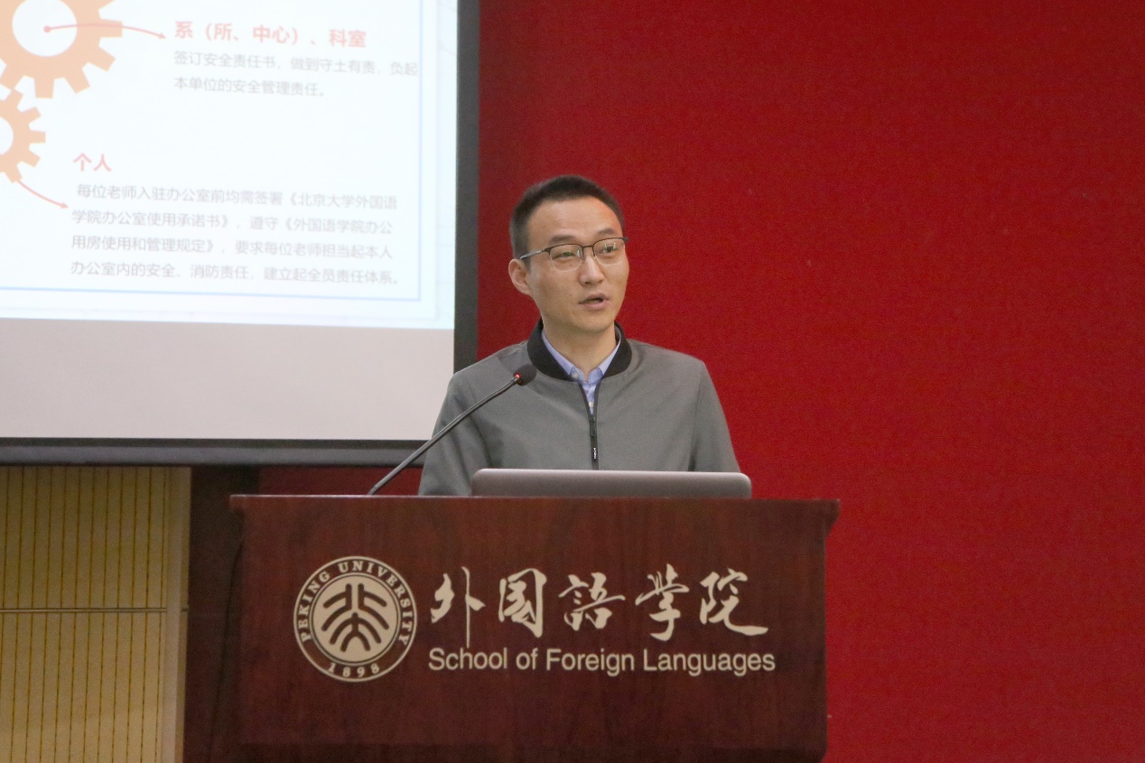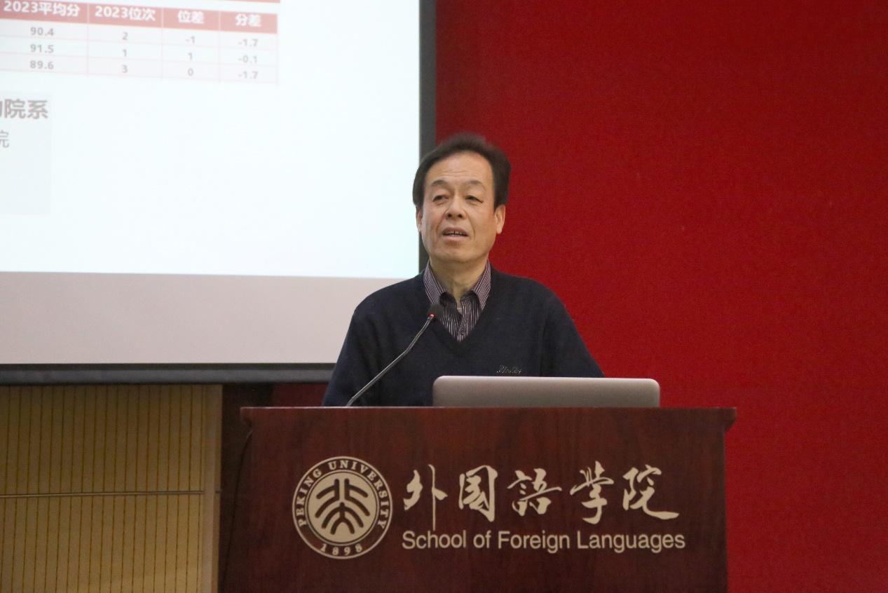 副院长付志明作本科教学、外事工作汇报。在外院全体教师的共同努力与积极配合下,本科教育教学任务顺利完成,在本科教学改革中取得了许多成绩。学院不断打造内容丰富的本科生专业选修课程,提升本科生学术能力。完善加强课程思政建设,推进“外语应用与劳动实践”课程,引领学生树立正确的劳动观念。外事工作方面,学院充分发挥外语学科优势,助力北大国际传播能力建设。引导外籍教师响应“一带一路”倡议,深入参与学科建设和文化交流工作。开展近50场海外学者学术交流,丰富了北大学术生活。