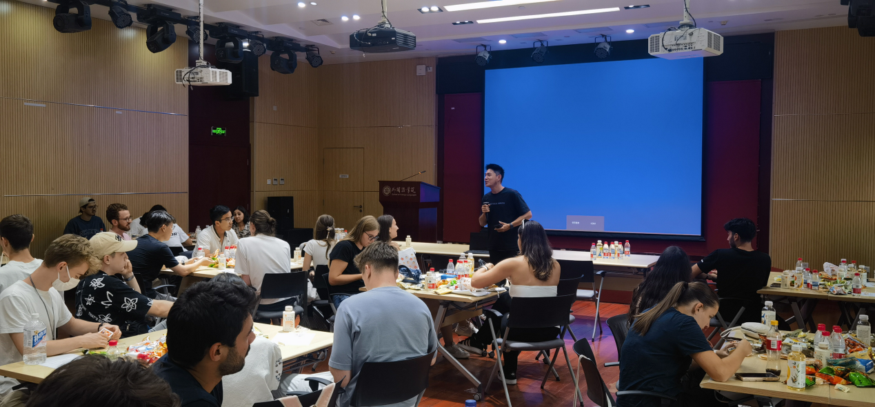 精彩的书法讲座之后,同学们通过精心设计的小游戏带领德国同学继续走进丰富多彩的中国文化。德语系2023级硕士生刘子婧主持“数字抱团”游戏,迅速活跃气氛,两国学生很快在互动中建立起友谊。《公共基础德语》课程优秀学生代表、法学院2023级本科生孙斯皇和德语系2024级本科生马希予合作主持了“你划我猜”游戏环节。两国学生分组通过肢体语言表现中德文化的许多代表性词汇(例如,“长城”“月饼”“浮士德”等),同学们充分发挥想象力,奉献了诸多巧妙构思,现场氛围越发热烈。